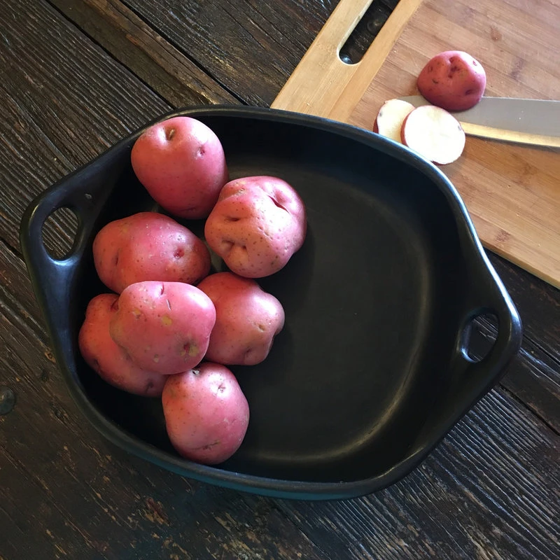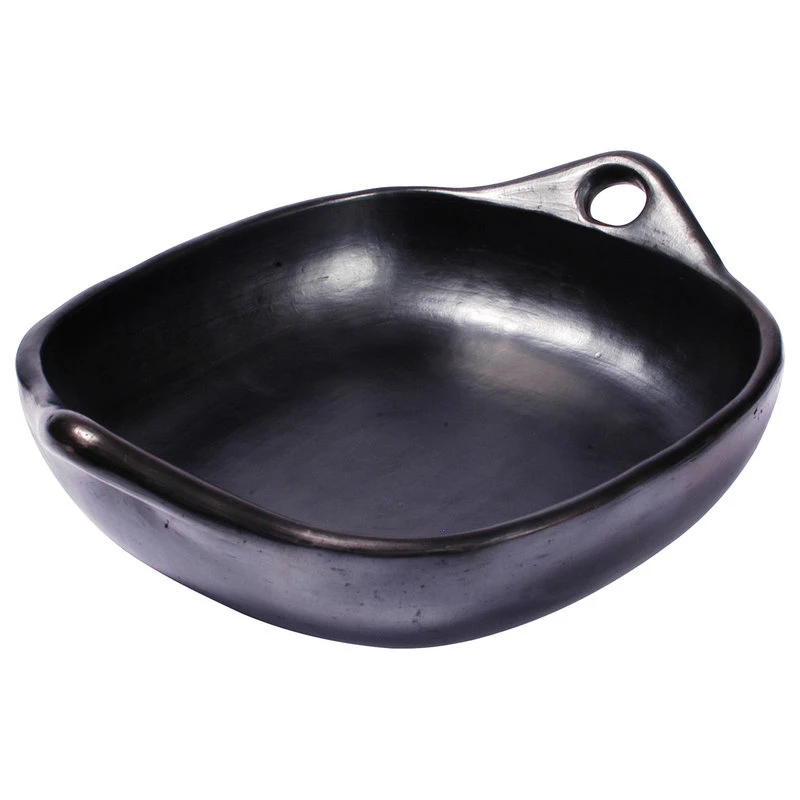 Whether you re roasting meats, chicken or vegetables, these roasting pans perform beautifully. Its clay form heats up evenly and keeps food warm long after it is removed from the oven. Length 11.5in (handles included), Width 9.5in (from outside), Height 2.5in and Capacity 2.0qt (filled comfortably without overflowing). Use for serving as well as for roasting with the ease of handles for handling with a great presentation especially for whole poultry, lasagna or other baked pasta dishes. Completely natural and safe, contains no toxins or lead and the porous nature of the clay allows the slow evaporation of steam and produce food that is healthier, tastier, and moist using less fat and liquids. Will last many years with proper use and care (each piece comes with a product information sheet outlining the Uses and Care for the product). Black Clay, La Chamba Cookware, is well-known and used throughout Colombia in restaurants and homes for preparing and serving traditional dishes. Its origins can be traced back at least 700 years to vases and pitchers found in pre-Columbian archaeological sites. It is still made in the traditional manner, by families in a small village on the banks of the Magdalena River in Central Colombia. Each piece is hand-made using local area clays, then hand burnished with a stone. The pieces are then fired in the village, giving them the distinctive black color and elegant look.