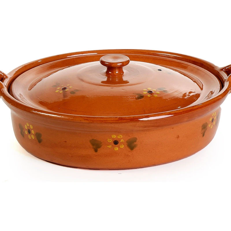 The Flat Casserole is perfect for the slow cooking of stews and casseroles, but due to its low profile, perfect for rice and seafood stews such as Paella. Length 17in (including handles), Width 14.25in, Height 6in, Diameter 12.5in and Capacity 6qt (filled comfortably without overflowing). Well suited for gas or electric ranges, and perfect for placing in an oven for finishing those rice dishes slowly. Since clay is a natural and porous material, it does not react with the food and causes a slow evaporation of steam from the pores. The moist enclosed interior results in food that is healthier and tastier as it requires less fat and liquids. The beautiful exterior finish makes for a great presentation for family style service. In the semi-desert region of Hidalgo, Mexico, our cazuelas are made by hand by artisans whose craft has been handed down for several generations.