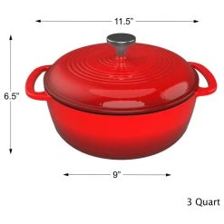 PRODUCT DETAILS- Materials: cast iron with enamel coating. Dimensions: Diameter (handle to handle)11.5 x (H)6.5; 3-quart capacity. Color: Red.