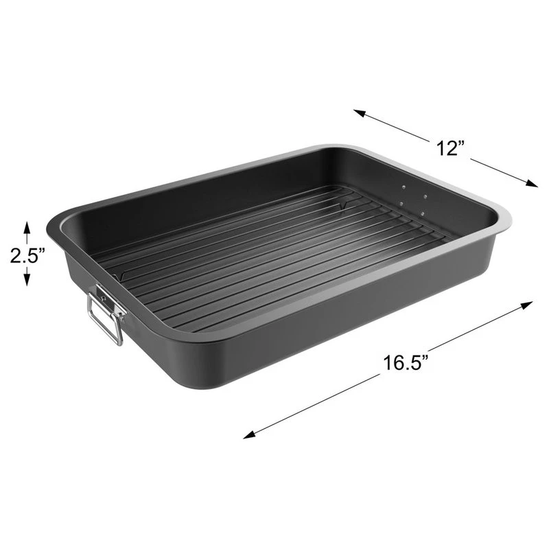 PRACTICAL DESIGN- The strong handles are securely riveted to the pan and fold down, making it safe and easy to pull the hot roaster from the oven. This versatile pan isn t just for roasts, it can also be used without the rack for lasagnas or casseroles!
