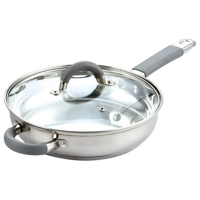 12-Piece stainless steel cookware set includes 1.1/2-Quart sauce pan with lid; 1.1/2-Quart casserole with lid; 2-Quart casserole with lid; 3-Quart casserole with lid; 5.1/2-Quart stock pot with lid; 10-Inch fry pan with lid.