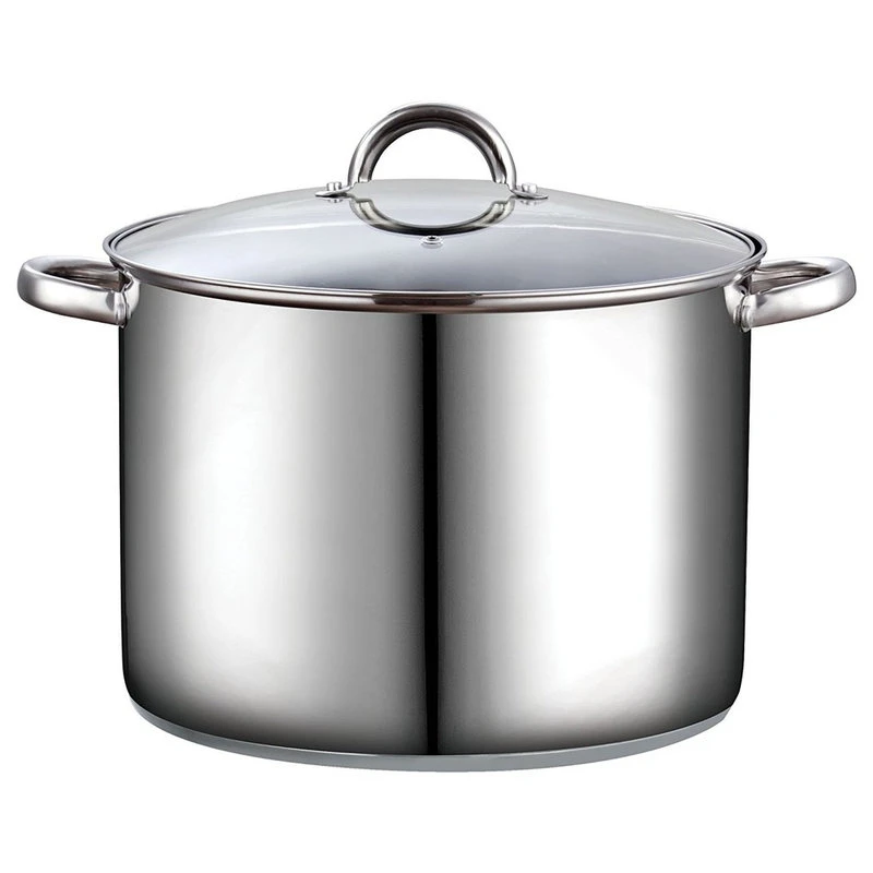 The Cook N Home 16 Quart Stainless Steel Stockpot with Lid has a mirror-polished stainless steel body and handles. Aluminum bottom between stainless steel provides even heat distribution. Tempered glass lid makes viewing food easy. Handles are riveted for strength and durability. Induction compatible. Dishwasher safe.