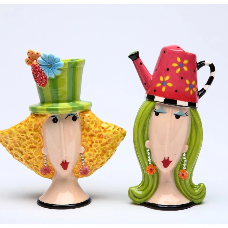 The Garden Lady Salt and Pepper Shakers make a fun, eye-catching addition to a kitchen island or table. This hand-painted ceramic set includes two women wearing colorful top hats shaped like buckets and watering cans. Hand wash only.