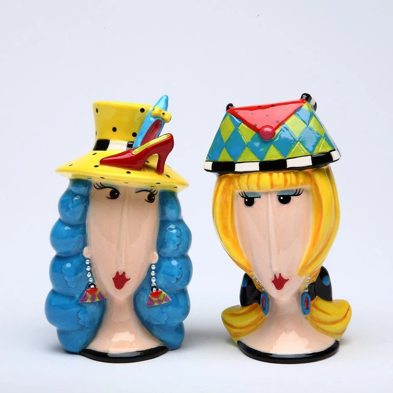 The Let’s Go Shopping Salt and Pepper Shakers make a fun, eye-catching addition to a kitchen island or table. This hand-painted ceramic set includes two women wearing colorful top hats shaped like purses and shoes. Hand wash only.