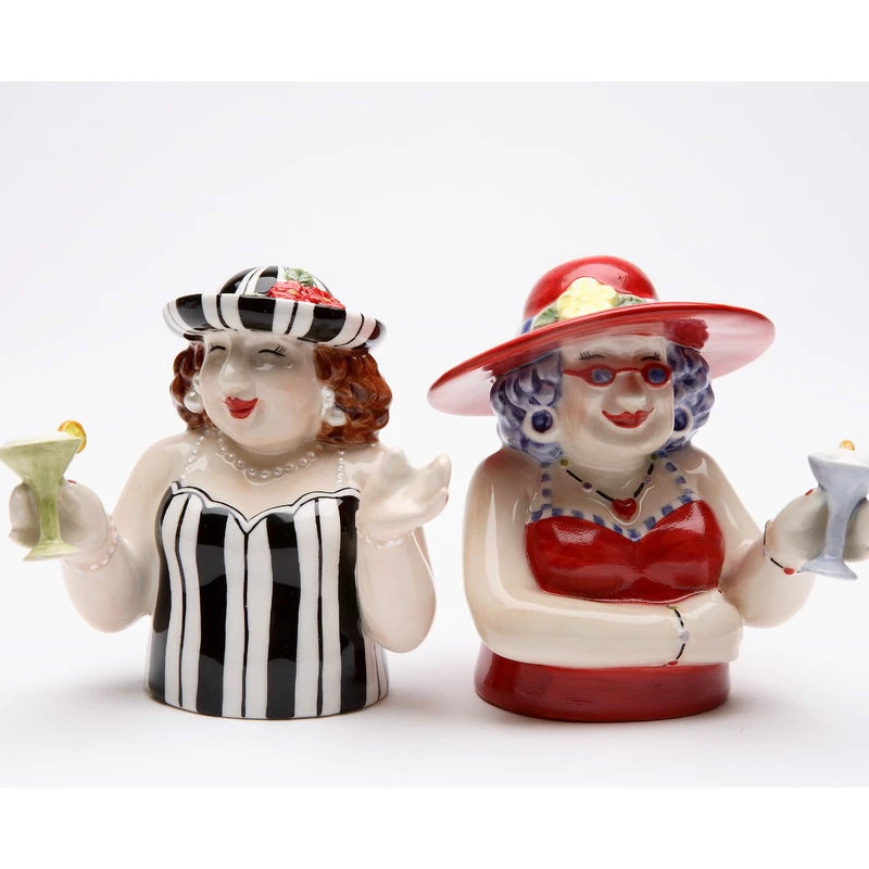 Switch out your average salt and pepper dispensers for these unique Sophisticated Ladies Salt and Pepper Shakers. This hand-painted ceramic set includes two female figurine shakers clad in elegant bathing suits and drinking cocktails.