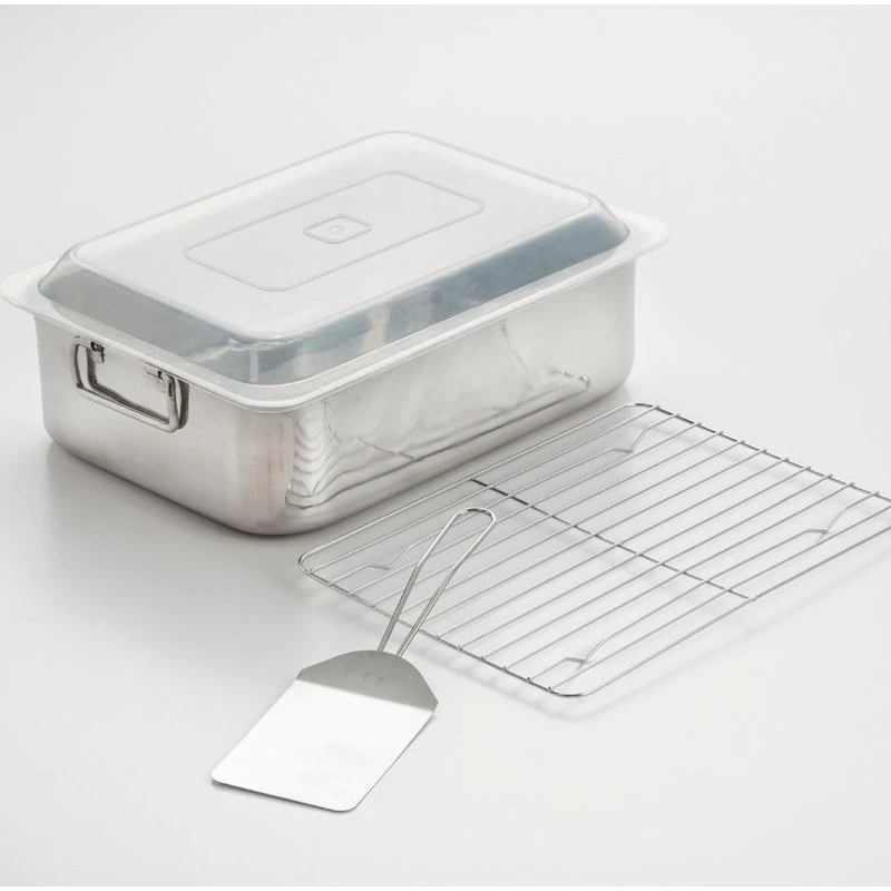Roaster constructed in stainless steel for durability. The deep dish design allows you to use it as a lasagna pan and is measured at 14.25? x 10.5″ x 4″. Includes a serving spatula for the perfect scoop as well as a plastic cover for easy storage of leftovers.