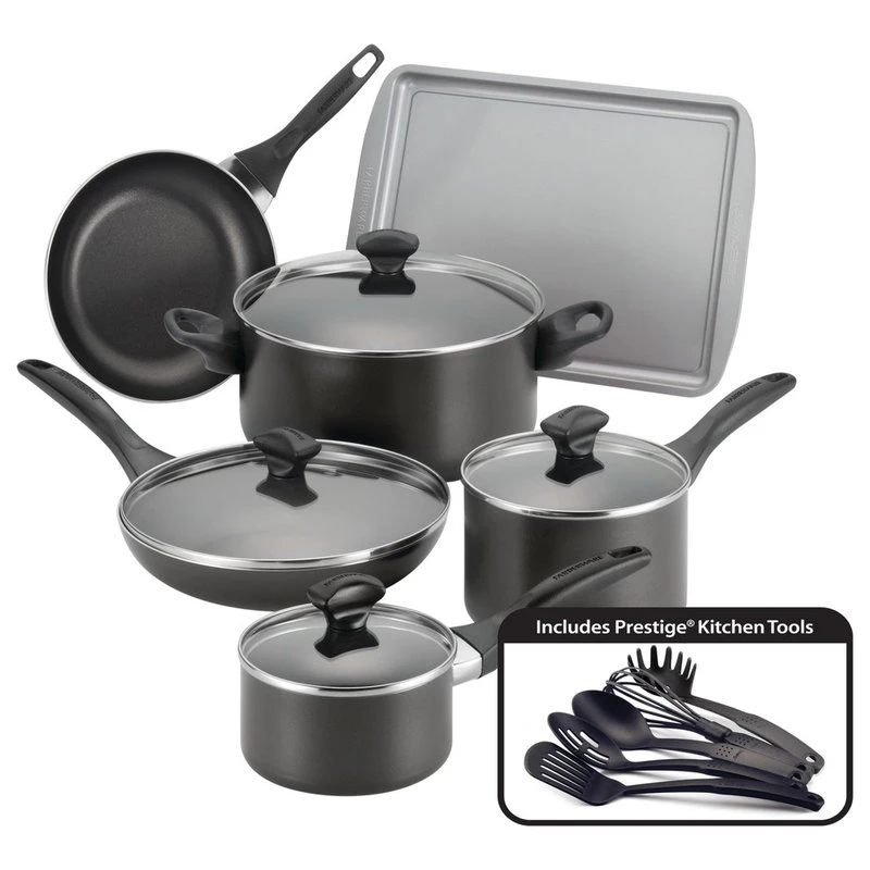 Farberware provides classic quality and dependability cooks have relied on since 1900, with modern styling for today. This Farberware Dishwasher Safe Nonstick 15-Piece Cookware Set is constructed from sturdy aluminum that heats quickly and evenly to help reduce hot spots that can burn food. Long-lasting top-quality nonstick coats the cookware interiors for excellent food release, while the sleek exteriors add a touch of style to any type of kitchen d?cor. Shatter-resistant glass lids feature easy-to-grasp knobs while allowing cooking to be watched without heat and moisture loss, and the double-riveted handles provide a strong grip. Oven safe to 350? F, as well as dishwasher safe, this set comes with five nylon Prestige(r) cooking tools that are easy on nonstick surfaces. And don’t forget dessert bake delicious bar, rolled or drop cookies to perfection on the medium cookie sheet, which is oven safe to 450? F. Add to the set with even more of the great, quality Farberware collection pieces for even more cooking convenience.