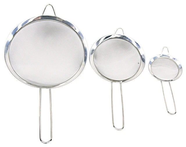 - Cook and strain your food the easy way with this handheld mesh strainer. Made from durable mesh steel. Handle to keep hot liquds away from your hand. Steel tip to rest on the edge of pots and sinks.