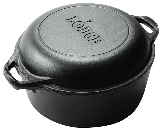 Enjoy the superior taste that well seasoned cast iron cookware offers without all the extra effort when you use this pre-seasoned Dutch oven from Lodge. Part of their renown Logic line, it has two helper handles for added convenience. Made in the USA, it also features a lid that can be easily converted into a skillet.