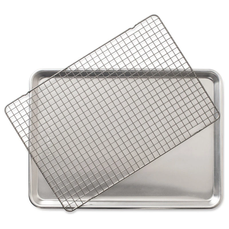 Maybe you’re in the mood for oven roasted Parmesan chicken, or perhaps you fancy orange glazed pork with a vegetable medley. No matter the oven or taste, this half-sheet with grid from Nordic Ware can handle the job. The half-sheet is made of natural aluminum while the nonstick grid is a steel insert that fits right inside the pan. Silicone baking mats, parchment paper, and the like are well suited for use with this sheet. Traditional butter, shortening, and flour techniques work with this sheet as well. This set is made in the USA and can withstand oven temperatures up to 400 degrees Fahrenheit.