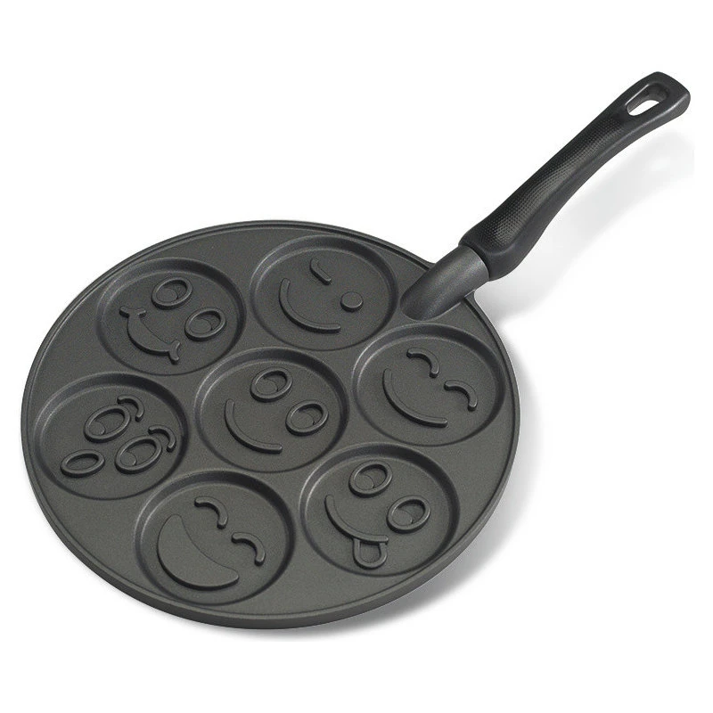 Whip up a fun breakfast with this smiley face pancake pan from Nordic Ware. Made of cast aluminum, this pan features seven different smiley faces. The long handle makes it easy to hold and move. Made in the USA and backed by a manufacturer’s 10 year warranty, this pan is the perfect addition to any kitchen.