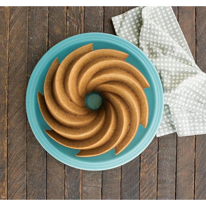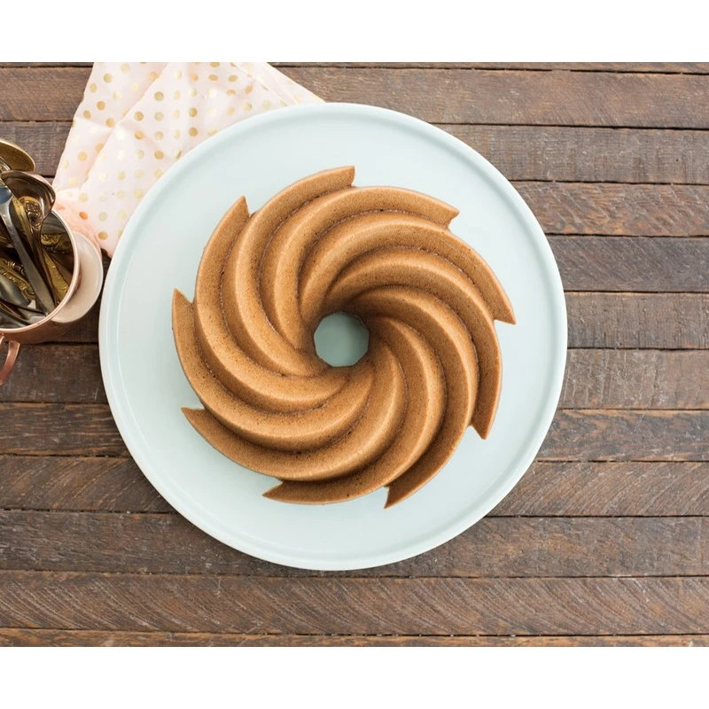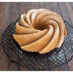 Give pound cake a festive flair by baking in this Heritage bundt mold from Nordic Ware. Made from cast aluminum, this pan is gold colored to give this already beautiful pan an extra touch. The baking surface is non-stick so that your cake easily releases. The symmetry of this pan makes it beautiful and perfect to use in all occasions. Its non-stick properties make it easy to clean, and it is made in the USA with a lifetime warranty.