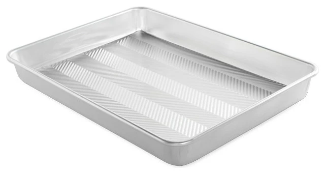 Bake up your favorite treat with this Nordic Ware Natural Prism high sided cake pan. Made of aluminum, this cake pan is ideal for brownies, cakes, and more. The embossed grid pattern adds strength, durability, scratch-resistance, easy release and improves air flow for crisping. Made in the USA, this cake pan is the perfect addition to any kitchen.