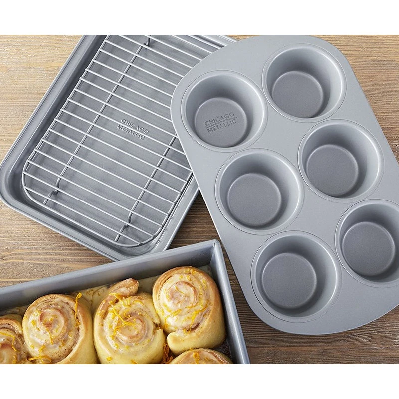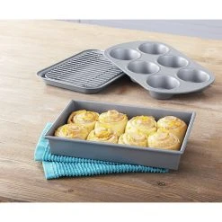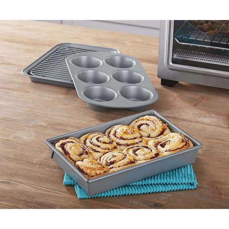This 4-piece set includes a 9.5 by 6.25-inch baking pan, 9.25 by 6-inch cooling rack, 11 by 7-inch roast/cake pan and an 11.5 by 7.3-inch, 6-cup muffin pan