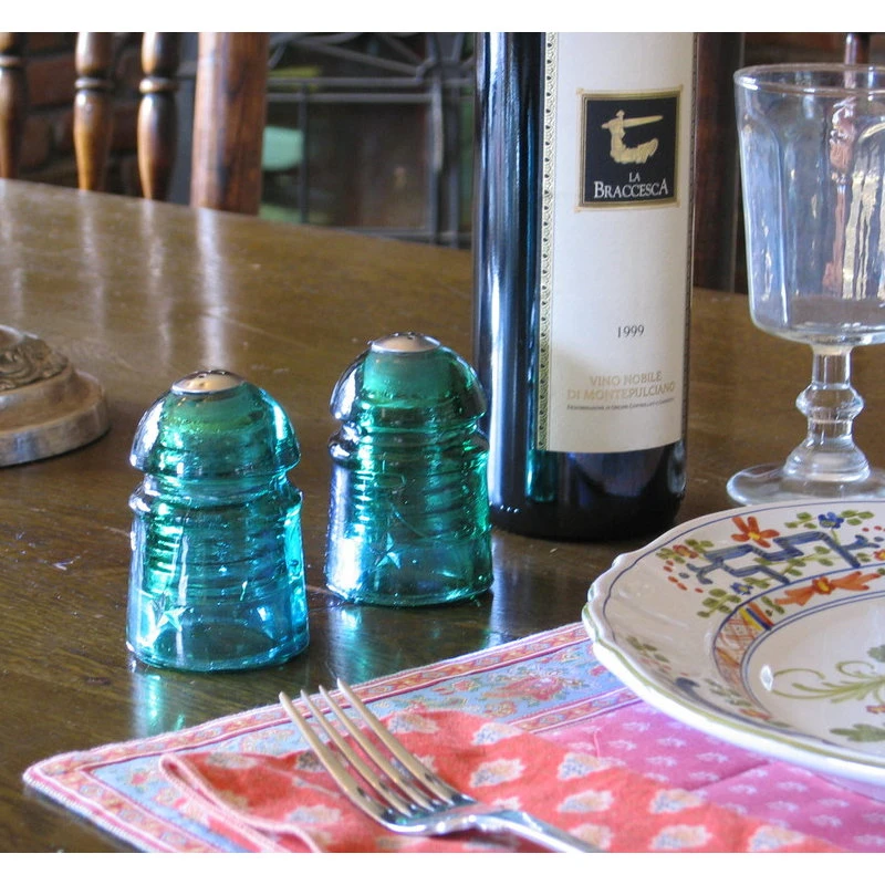 A conversation starter in the kitchen or on your dinning room table, this pair of glass Insulator Salt & Pepper Shakers are made from our pony insulators. It holds 4 oz of spice. It comes with a removable food grade neoprene cap and a SS shaker cap.