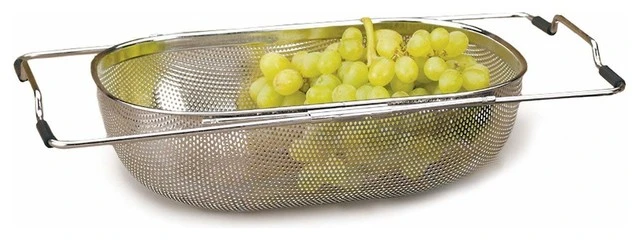 Drain and strain with ease with the help of the in-sink drainer from RSVP’s Endurance line. This perforated, stainless steel drainer fits perfectly over kitchen sinks with the help of its expandable handles. Never worry about your dinner falling out of a wobbly, rounded strainer again. In addition, the rubber handles make the drainer easy to pick up and transfer anywhere. This drainer is dishwasher safe for easy clean up.