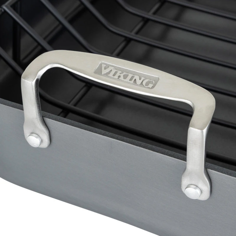 Viking designed this roasting pan with the home cook in mind by integrating several unique features. The unique inverted handles allow the roaster to fit into ovens with ease, minimizing space versus roasters with handles extended outward. The inverted handles also make the roaster ergonomically easier to put into and take out of the oven. The roaster can fit up to a 25 pound turkey and comes with a v-shaped, PFOA and PFOE free eternal non-stick cooking rack. The elevated rack helps cook food quicker and more evenly. The Hard Anodized design features an aluminum layer having gone through a chemical process that makes it the most durable roasting pan for your kitchen complete with a nonstick cooking surface. Dishwasher safe. Limited Lifetime Warranty.