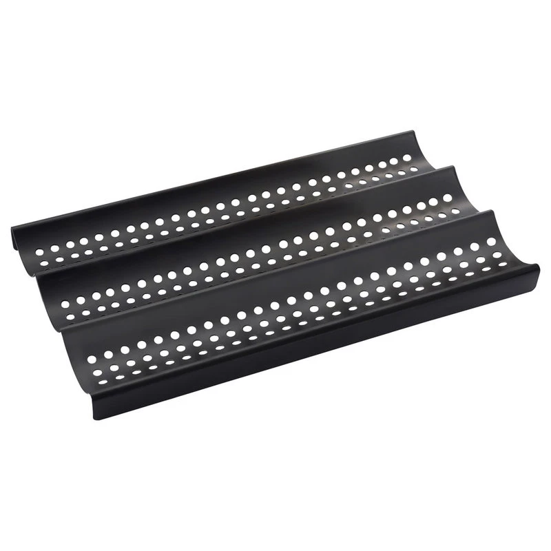 The ZenUrban 870002 nonstick 3-loaf perforated baguette French bread pan forms those delightful long slender loaves of bread that we all love. The holes in this pan allow complete air circulation around the bread loaves. Made of commercial-grade carbon steel for even heat retention, and coated with a dishwasher nonstick surface for easy cleaning. The pan measures 16 x 9 x 1-inch (41 x 23 x 3 cm) and has three troughs so you make three loaves in one pan. The pan can easily be placed on the shelf of your oven or directly on a baking stone to get the benefits of stone baking. These pans are designed to hold 1 1/2-pounds of bread dough. Non-metal utensils should be used to prevent damage to the finish.